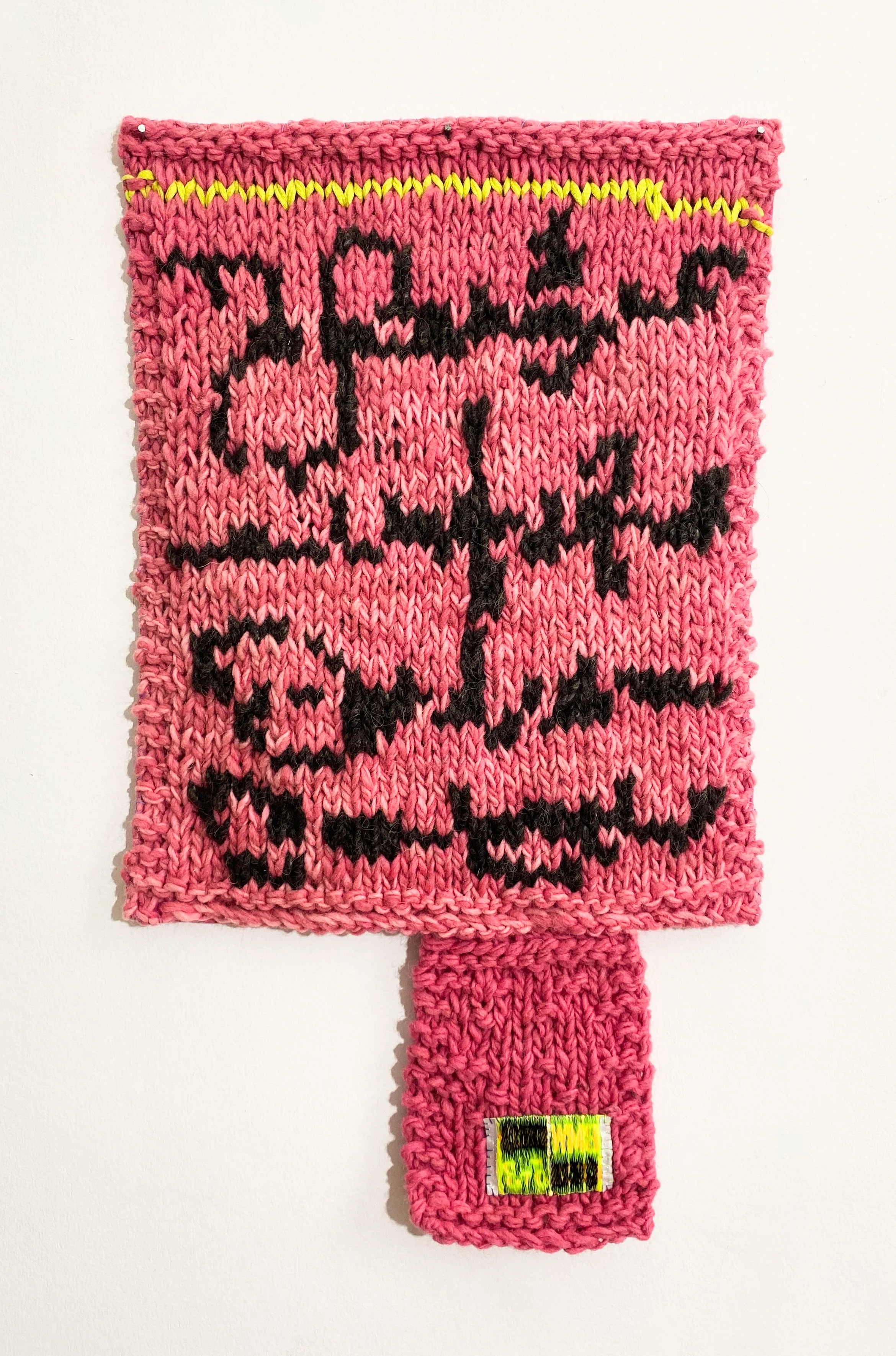 Nota rosa, 2026 // Wool, fabric and steel eyelets (Knitting and crochet. Hand sewing) // 64 x 37 x 3 cm